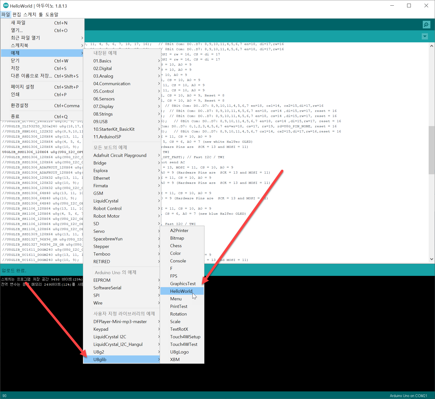 라이브러리가 설치가 되었다면 예제중에 가장 쉬운 hello world가 눈에 보인다.
